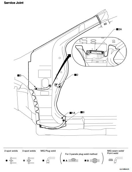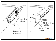 • Determine cutting position and record distance from the locating indent. Use this distance when cutting the service part. Cut outer front pillar over 60 mm above inner front pillar cut position.