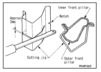 • Prepare a cutting jig to make outer pillar easier to cut. Also, this will permit service part to be accurately cut at joint position.