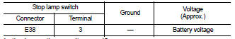 4. Check voltage between stop lamp switch connector E38 terminal 3 and ground.