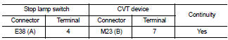 Check continuity between stop lamp switch connector E38 (A) terminal 4 and CVT device connector M23 (B) terminal 6.