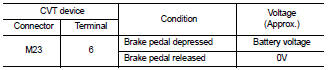 3. Check voltage between CVT device connector M23 terminal 6 and ground.