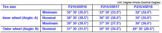 • With the engine at idle, turn steering wheel from full left stop to full right stop and measure the turning angles.