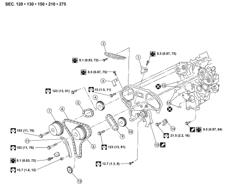 • During alignment, be careful to prevent dislocation of mating mark alignments of the secondary timing chains.