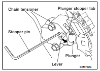b. Insert stopper pin into tensioner body hole to hold lever, and keep the tab released. An Allen wrench [1.2 mm (0.047 in)] is used for a stopper pin as an example.