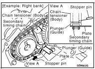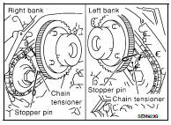16. Attach a suitable stopper pin to the right and left camshaft chain tensioners (for secondary timing chains).