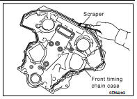 21. Use a scraper to remove all of the old Silicone RTV Sealant from the front timing chain case and opposite mating surfaces.