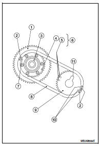 b. Align the dowel pin (3) with and pin hole on the camshaft sprocket INT side (1), and dowel pin groove (11) with the dowel pin on the camshaft EXH side, and install them.