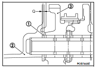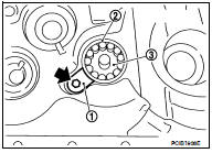 • When adjusting reverse idler gear end play, select adjusting shim for reverse idler gear. To select adjusting shim (1), measure clearance between transaxle case (2) and reverse idler gear (Rear) (3).