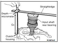 2. Using a depth micrometer and straightedge as shown, measure dimension “O2” between clutch housing end face and end face of input shaft rear bearing.