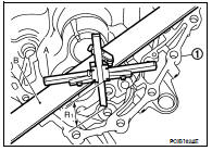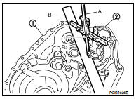 1. Using a depth micrometer (A) and straightedge (B), measure dimension “R1” between transaxle case (1) end face and mounting face of adjusting shim.