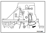 d. While rotating shifter lever A (1) in the direction of the arrow shown, assemble transaxle case to clutch housing.