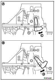 a. Shift the shifter lever A (1) to 2nd gear position (A), and then rotate it in the direction of the arrow (C) until it stops. Using this position as the reference point, measure the amount of movement when shifting shifter lever A to 1st gear position (B) and rotating it in the direction of the arrow (D) until it stops. This measurement is the "M" dimension.