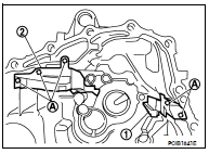 • When adjusting striking rod end play, select adjusting shim (1) for striking rod (2). To select adjusting shim, measure clearance between transaxle case (3) and striking rod shim (4).
