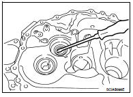 g. Accessing from the bore plug hole, expand snap ring at mainshaft rear bearing so that the ring catches the periphery of mainshaft rear bearing.