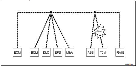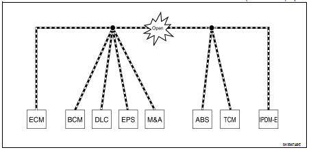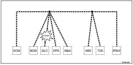 NOTE: • When data link connector branch line is open, transmission and reception of CAN communication signals are not affected. Therefore, no symptoms occur. However, be sure to repair malfunctioning circuit.