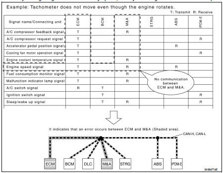 The CAN communication signal chart lists the signals needed for trouble diagnosis. It is useful for detecting the root cause by finding a signal related to the symptom, and by checking transmission and reception unit.