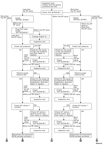 NO >> “B/FUEL SCHDL” is more, “A/F ALPHA-B1” is less than the SP value: GO TO 21.