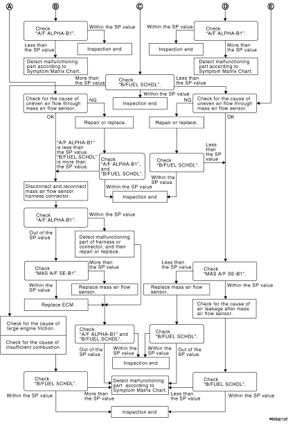 The SP value will be displayed for the following three items: • B/FUEL SCHDL (The fuel injection pulse width programmed into ECM prior to any learned on board correction) • A/F ALPHA-B1 (The mean value of air-fuel ratio feedback correction factor per cycle) • MAS A/F SE-B1 (The signal voltage of the mass air flow sensor)